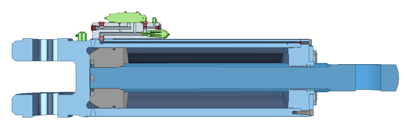 Durch digitale Zwillinge und Einbauprototypen im CAD konnte der Zylinder passgenau in das Maschinenlayout integriert werden – ohne zusätzlichen Konstruktionsaufwand auf Kundenseite. Dabei wurde besonders der enge Bauraum innerhalb der Maschine berücksichtigt. Die Fertigung erfolgte auf hochpräzisen CNC-Anlagen, mit abschließender Druckprüfung.